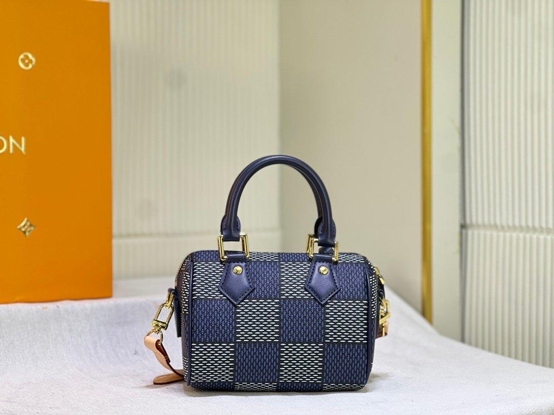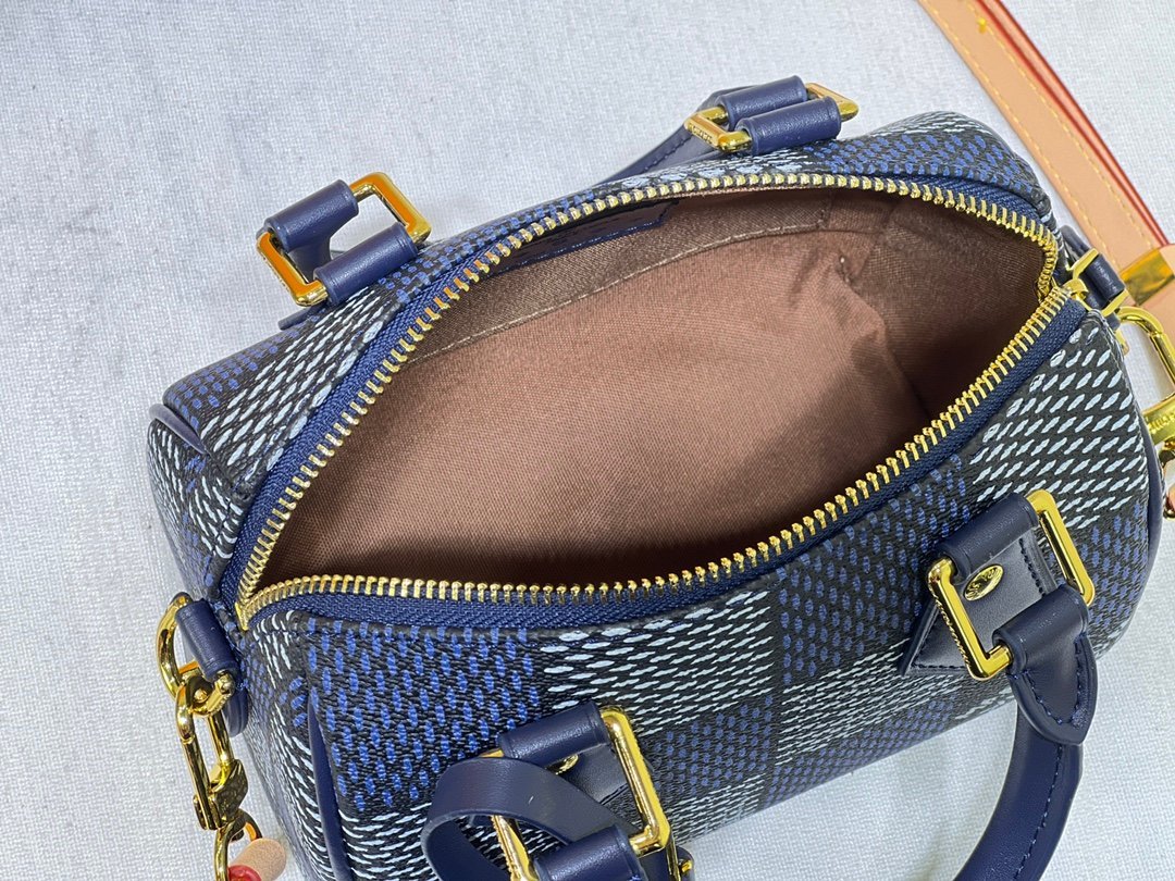 The handbag interprets the Speedy handbag of the 1930s with an exquisite design. It uses the Damier Pop coated canvas created by creative director Pharrell Williams to outline the classic lines and renders bright colors for the Damier checkerboard pattern. Size: 18x12x10cm.