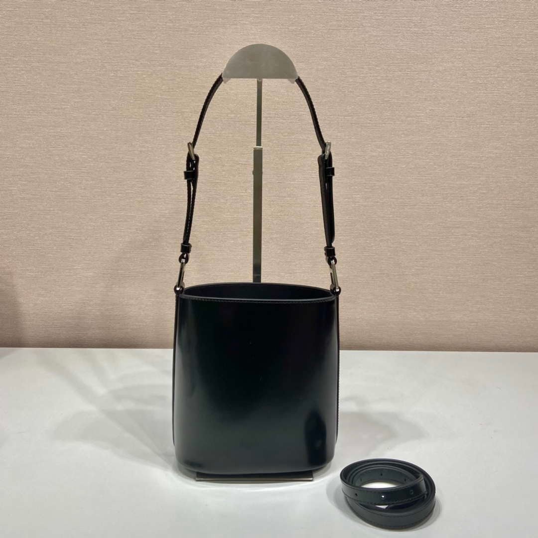 The bucket bag. a recurring design in Prada collections. comes in a mini version with modern allure. decorated with the enameled metal triangle logo and accented with a leather shoulder strap so it can be worn as a cross-body or shoulder bag. Fine brushed leather with its distinctive lustrous finish has been reinterpreted by Prada since the ’90s on unexpected designs for a hybrid result that reflects the duality of the brand.